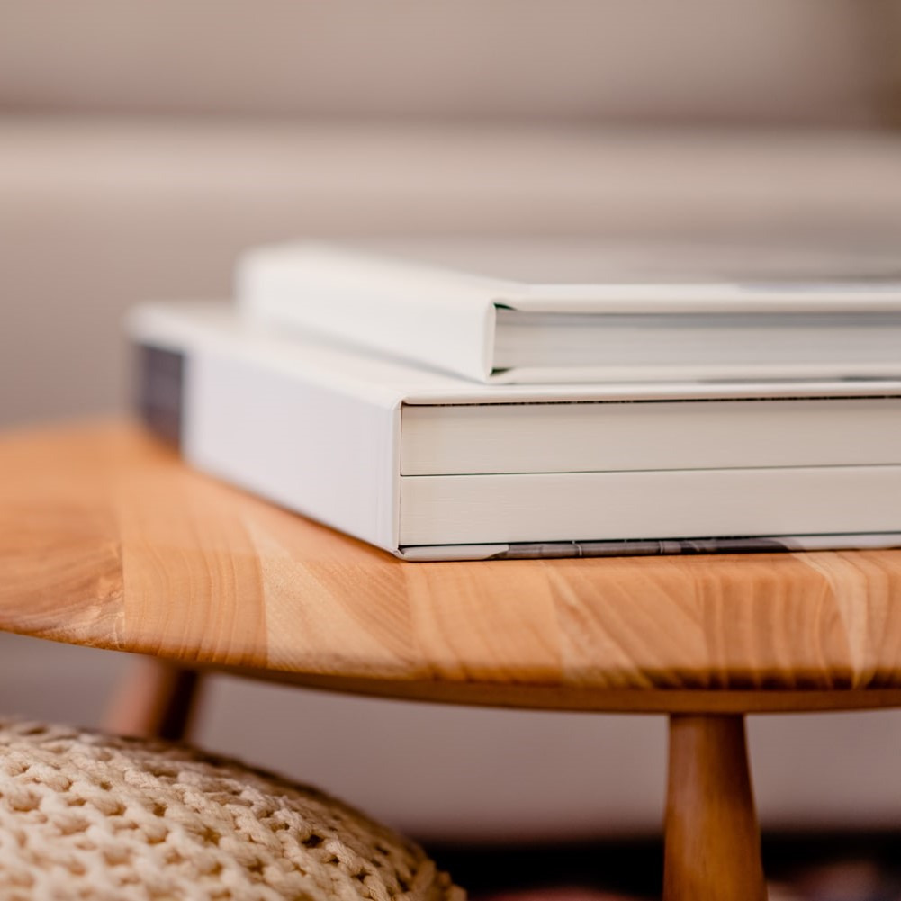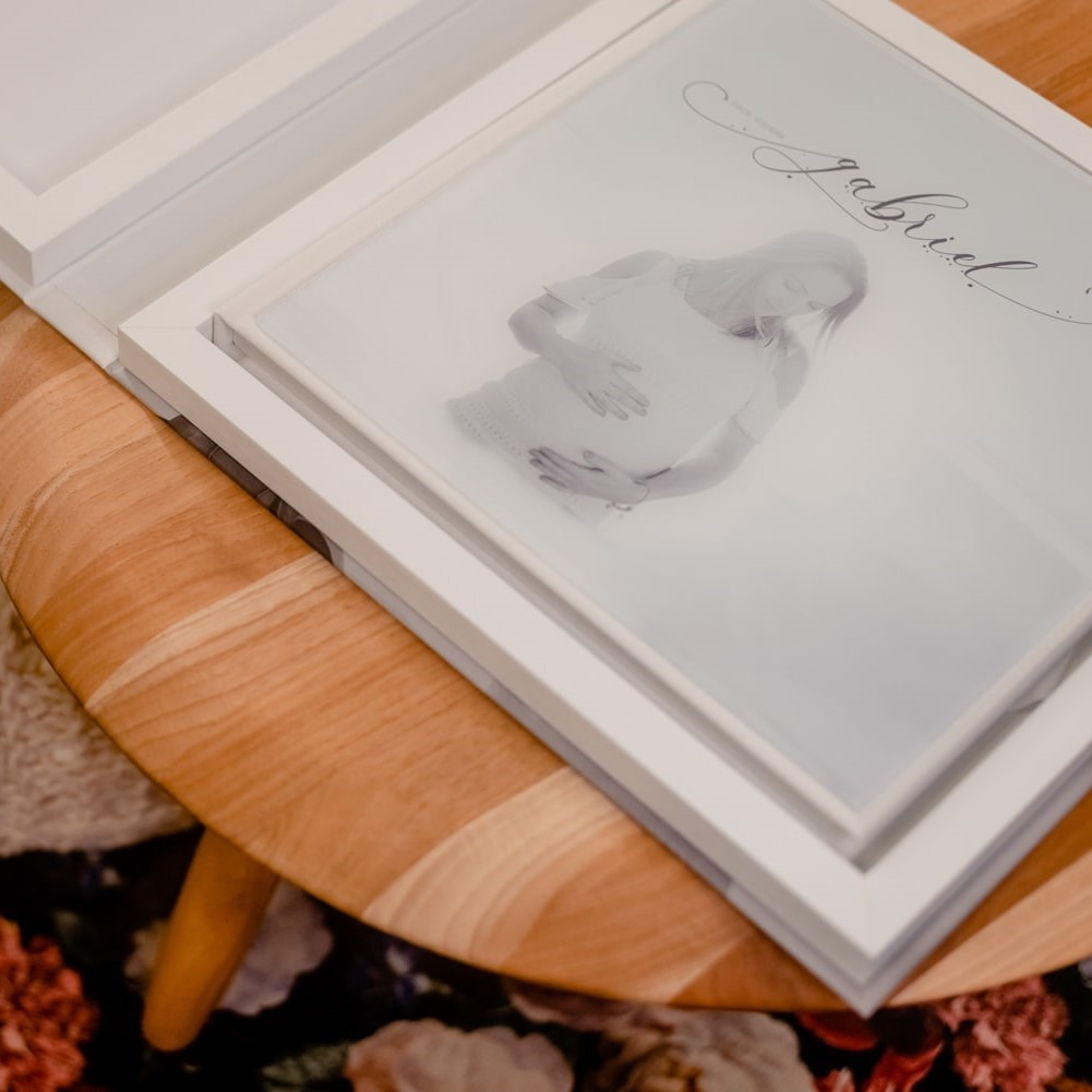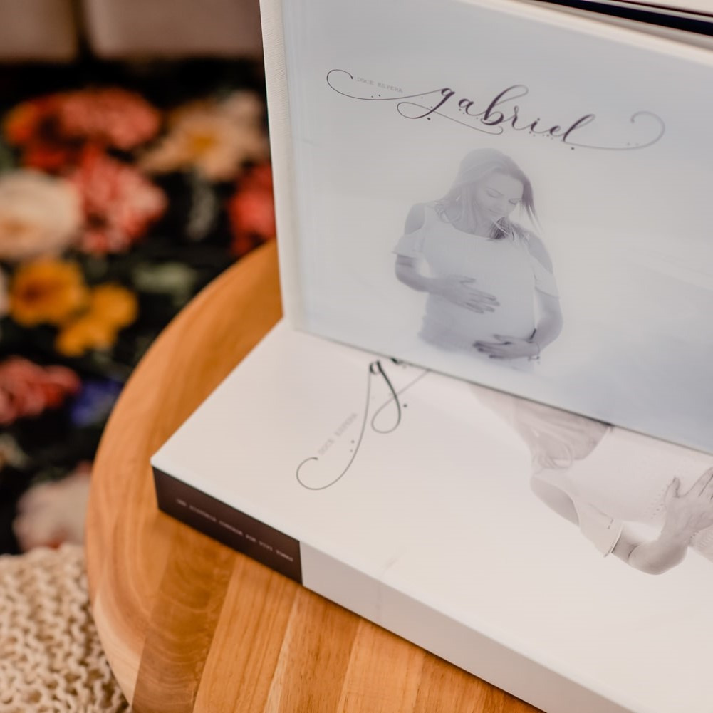 Capa dura revestida em couro sintético: Branco, Preto ou Bege e duas opções de acabamentos sobreposto: Impresso no Acrílico ou MDF
